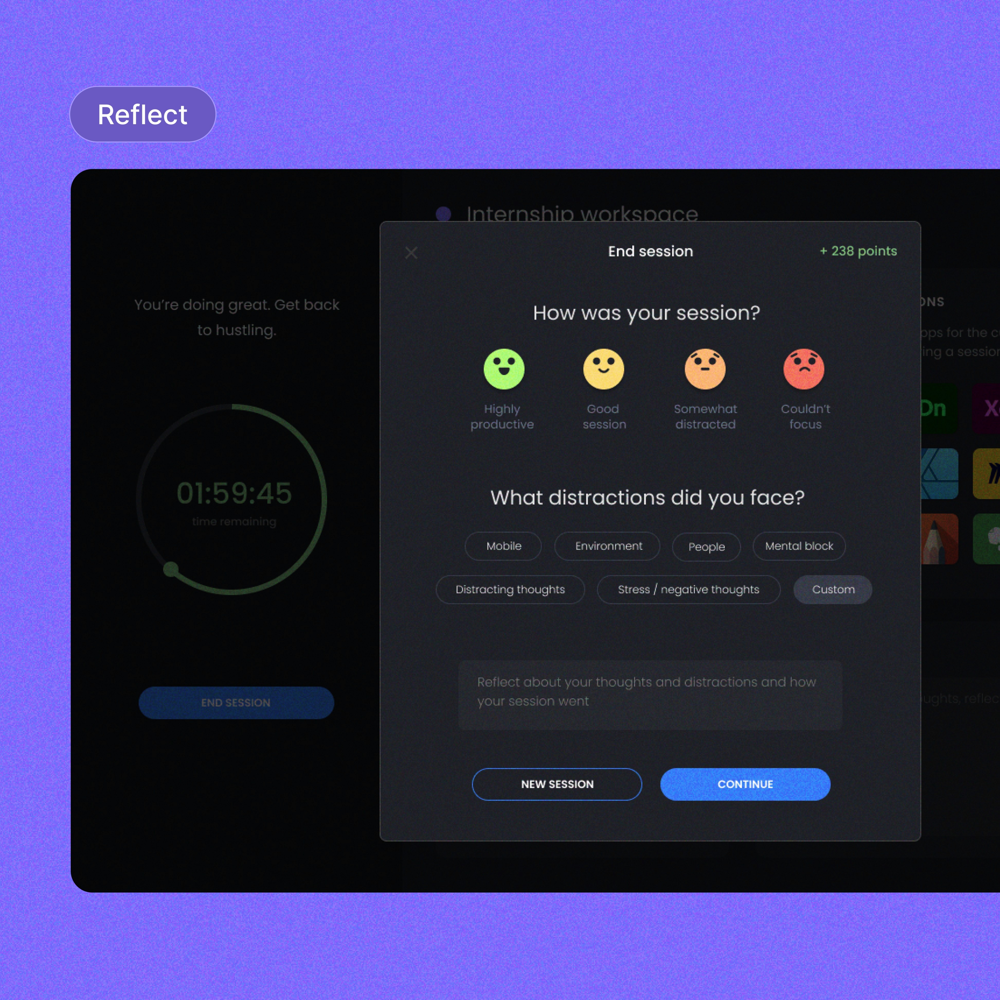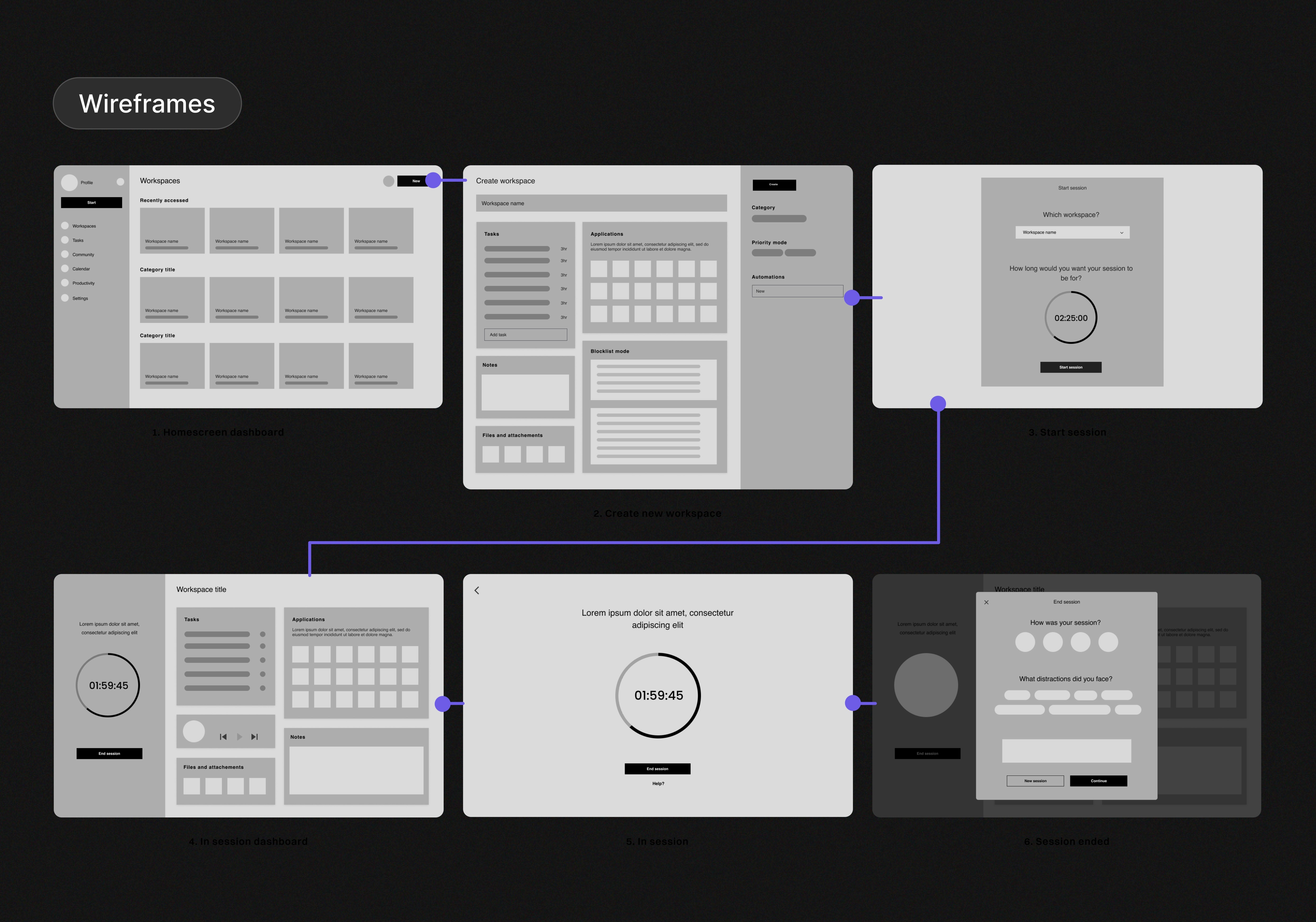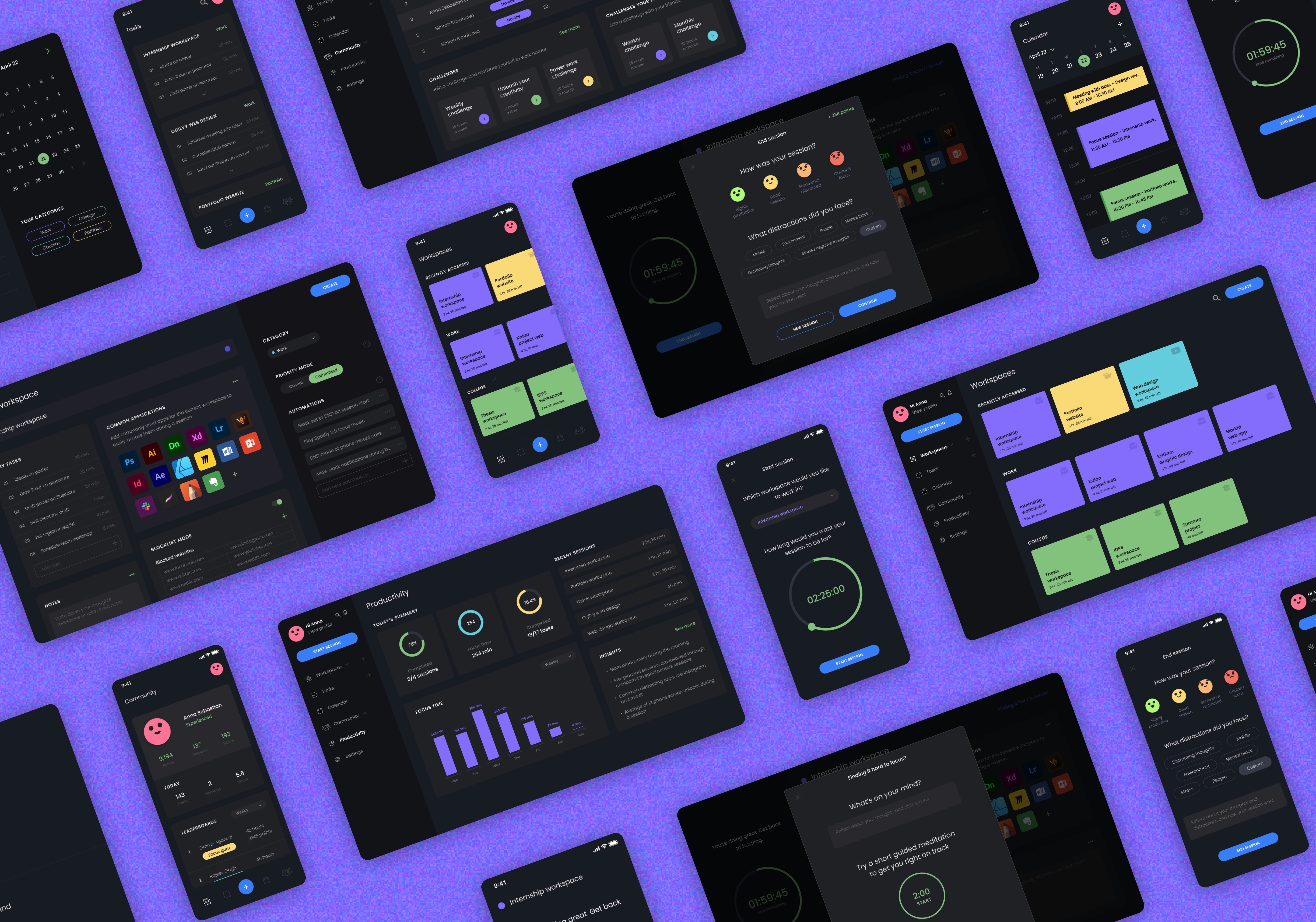 For my thesis, I chose a specific domain and problem to address. After exploring various options, I decided to focus on the issue of frequent distractions and lack of focus. Leveraging the knowledge gained from previous semesters, I conducted research to validate the problem and develop a solution. This involved designing the platform's structure, flows, wireframes, and high-fidelity screens for both mobile and desktop devices. Throughout the project, I collaborated closely with my mentor and received regular feedback to navigate any uncertainties and reach a final solution.