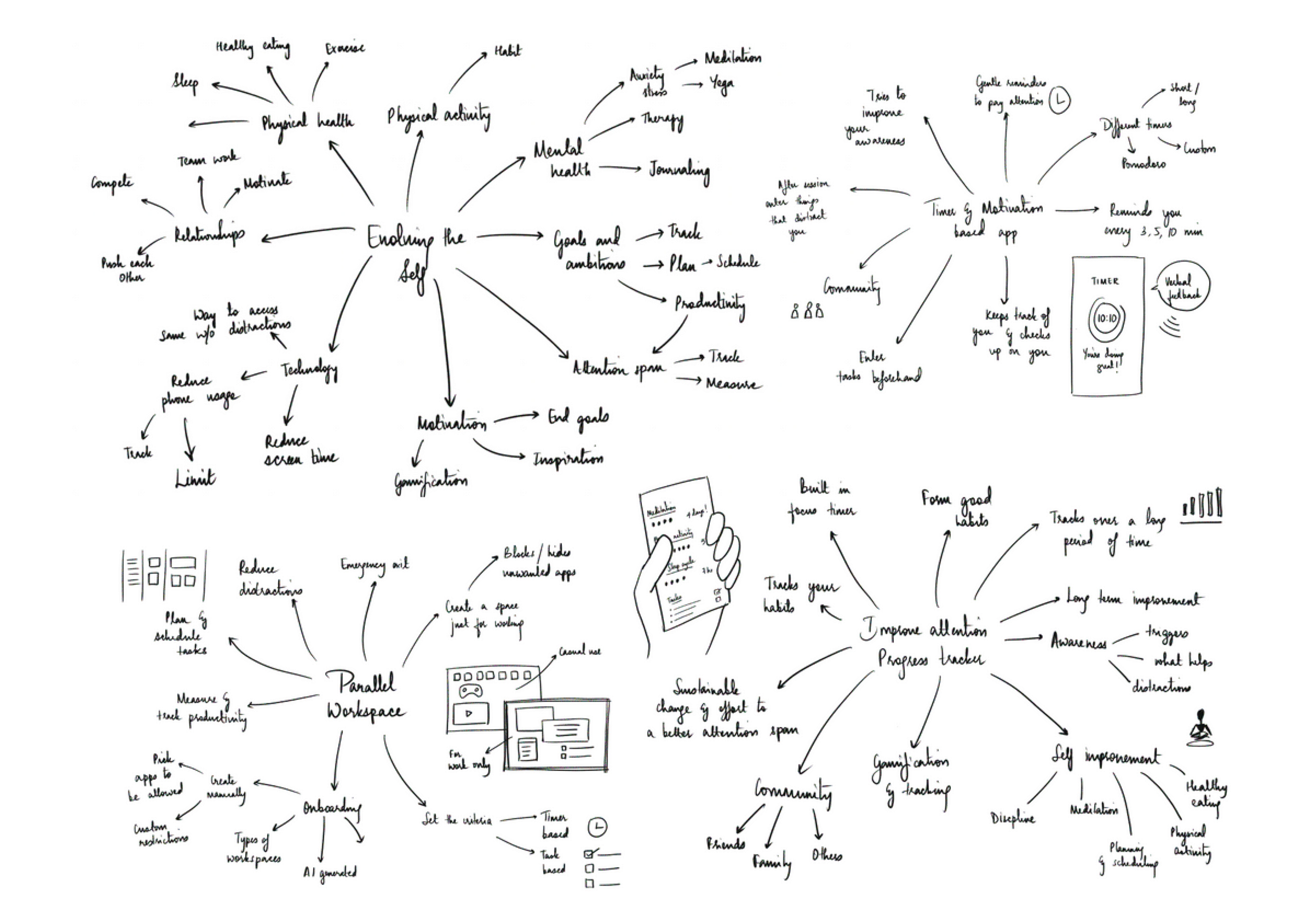 Collaborated with my mentor to validate ideas and identified key aspects for the platform. I pursued the concept of a timer-based focus application for task and workspace management, aiming for cross-device integration to track distractions. The focus was on fostering mindfulness and minimizing disruptions to enhance concentration. Further detailing involved creating storyboards to empathize with users, consolidating personas, insights, and research findings. This approach prioritized the user experience over visuals, aiding in focused prioritization.