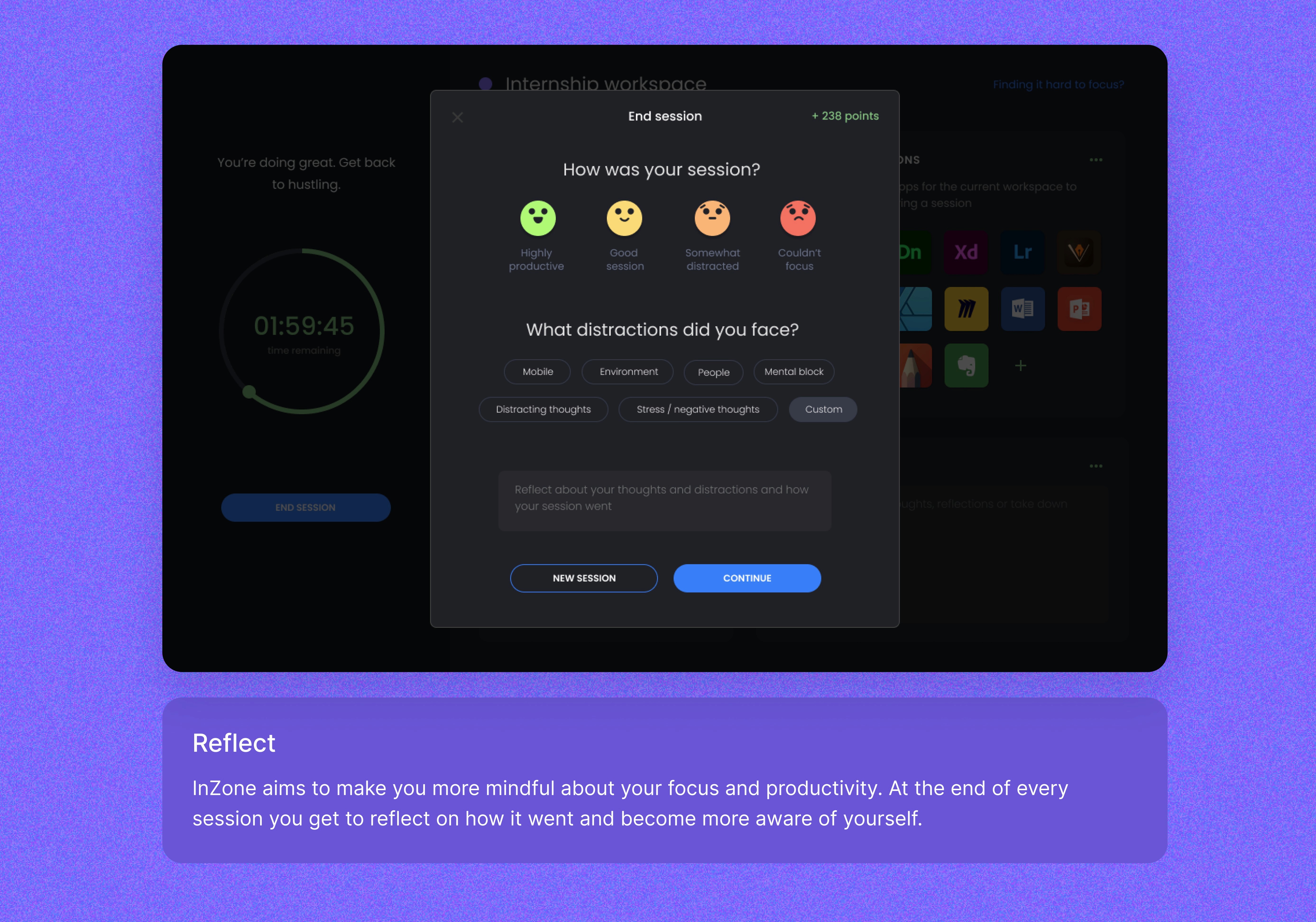 Synchronize sessions seamlessly across multiple devices, including laptops, mobile phones, tablets, and smartwatches. InZone diligently tracks distractions, providing a comprehensive overview of your focus patterns.