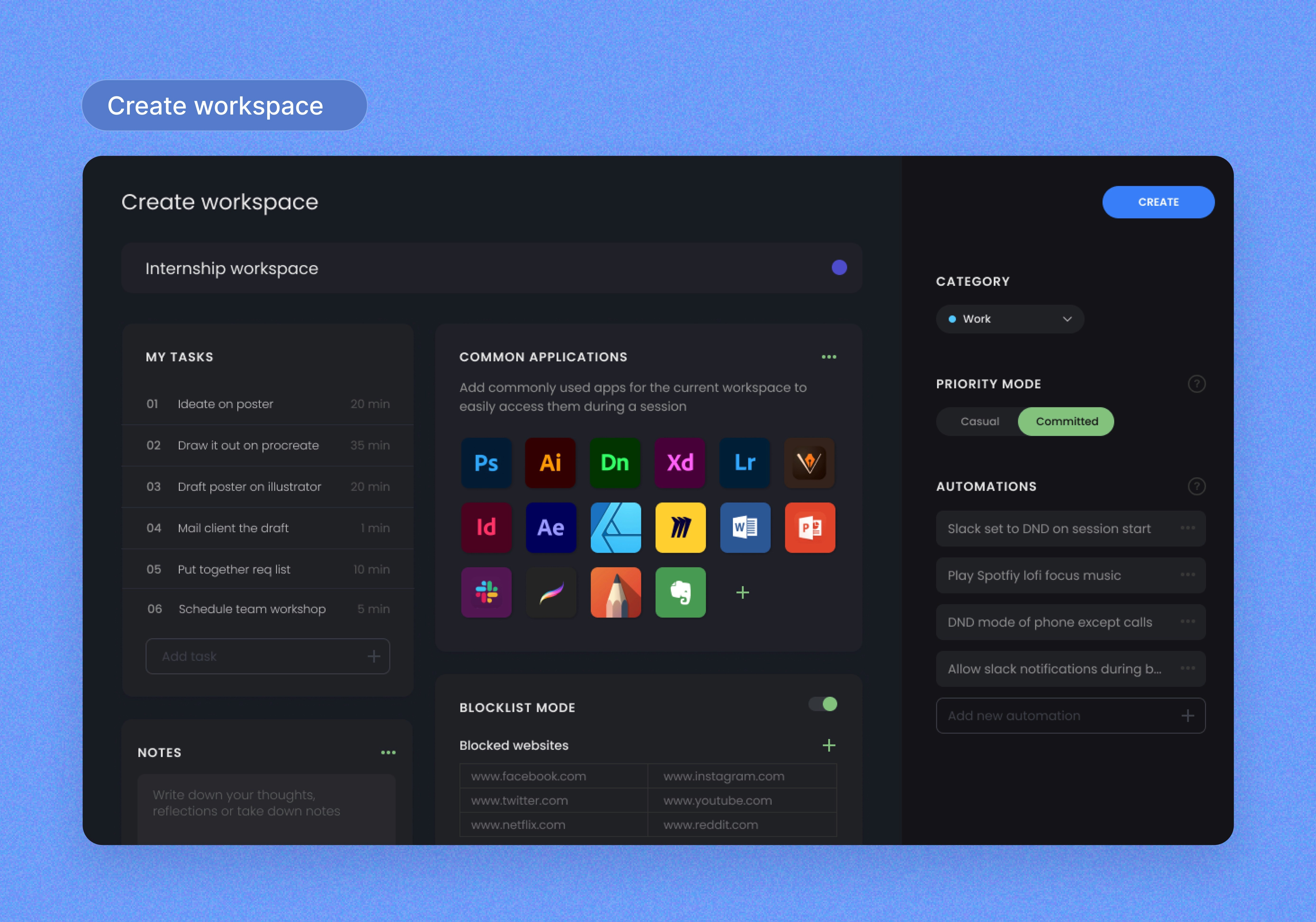 Effortlessly create and manage diverse workspaces tailored for specific tasks. Customize applications, tasks, block lists, and more for each workspace, ensuring efficient organization.