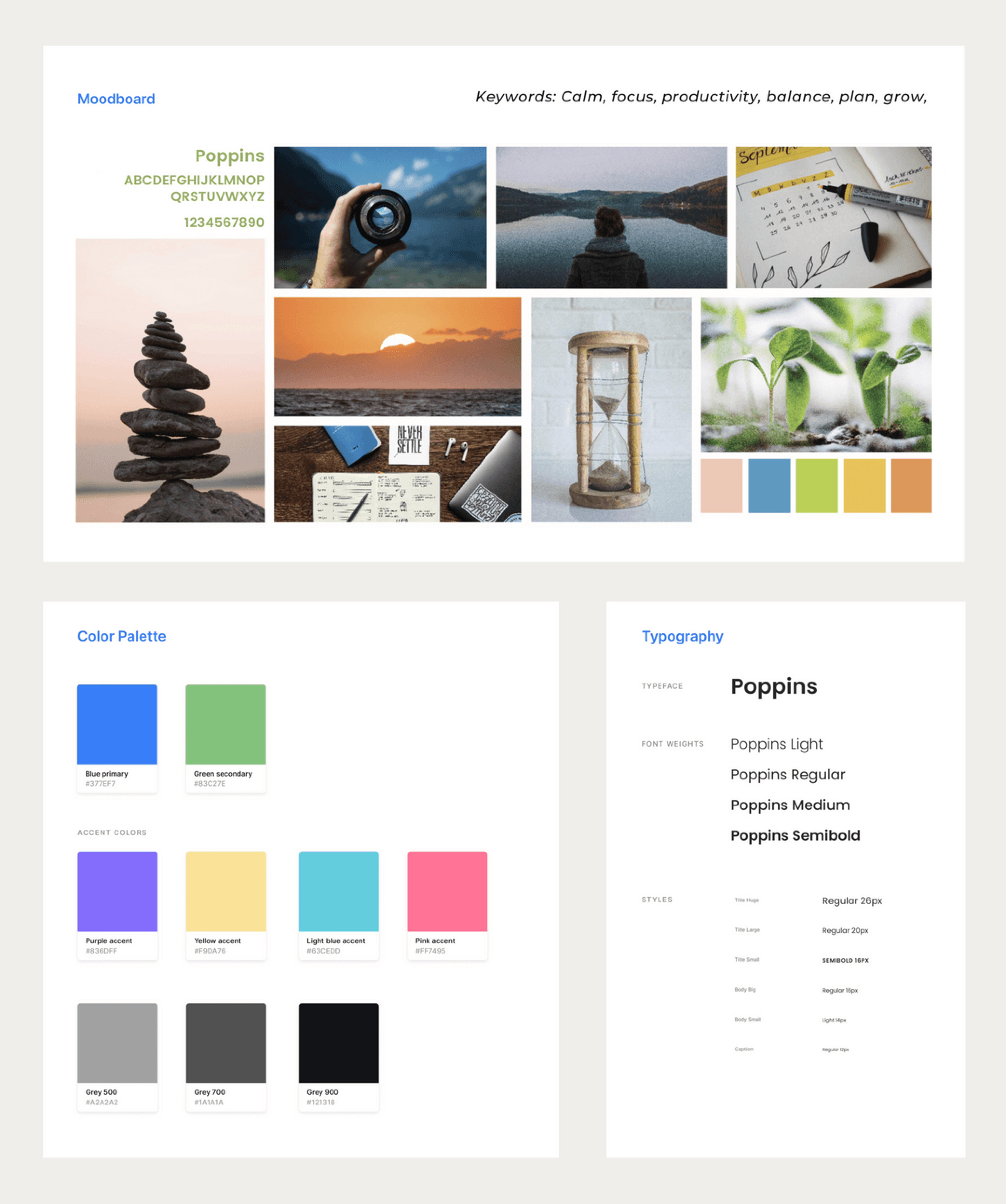 Aimed for a visually appealing platform with a clean and engaging style guide. Developed a color palette reflecting keywords like calm, focus, and productivity to create a refreshing atmosphere for users.