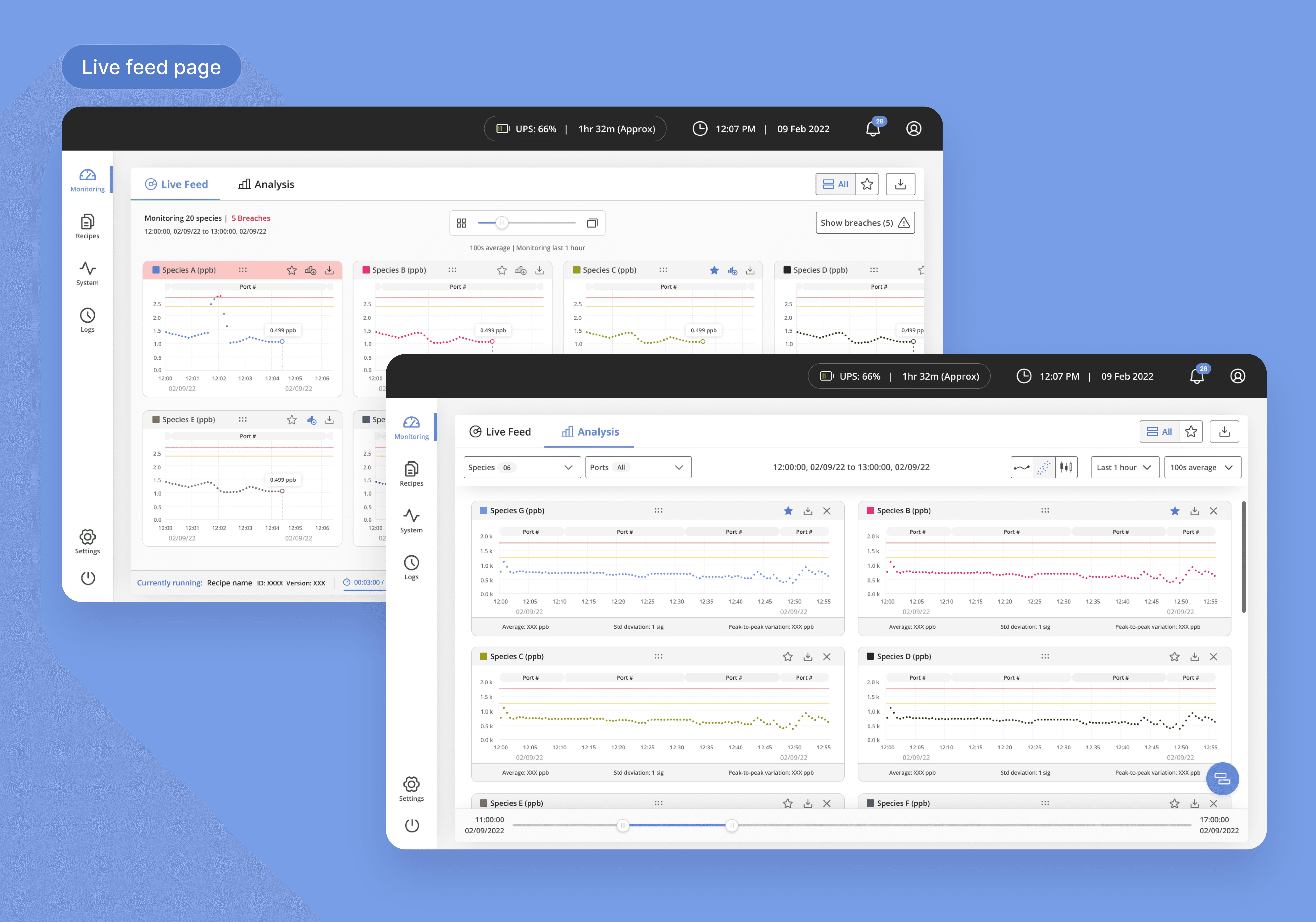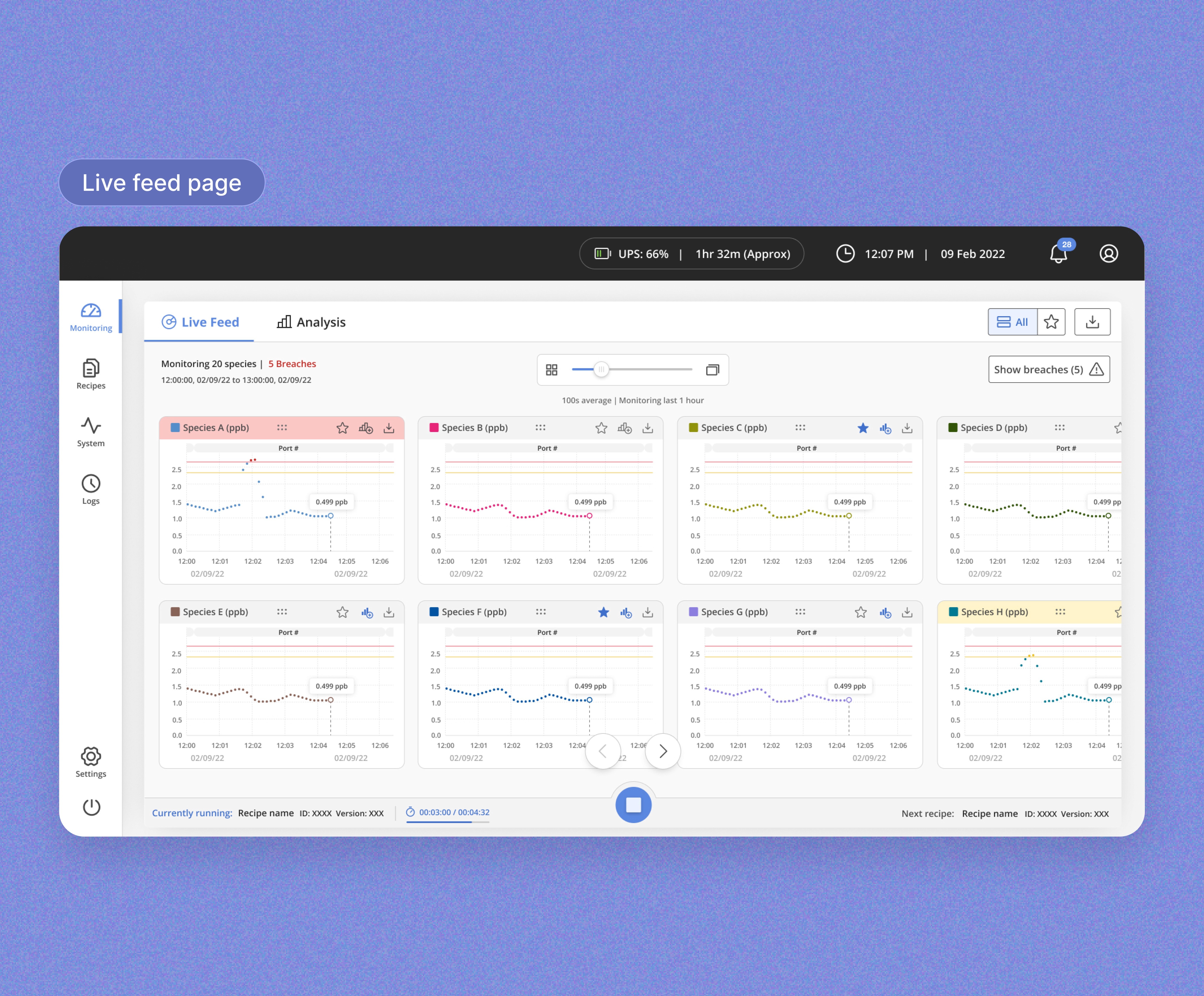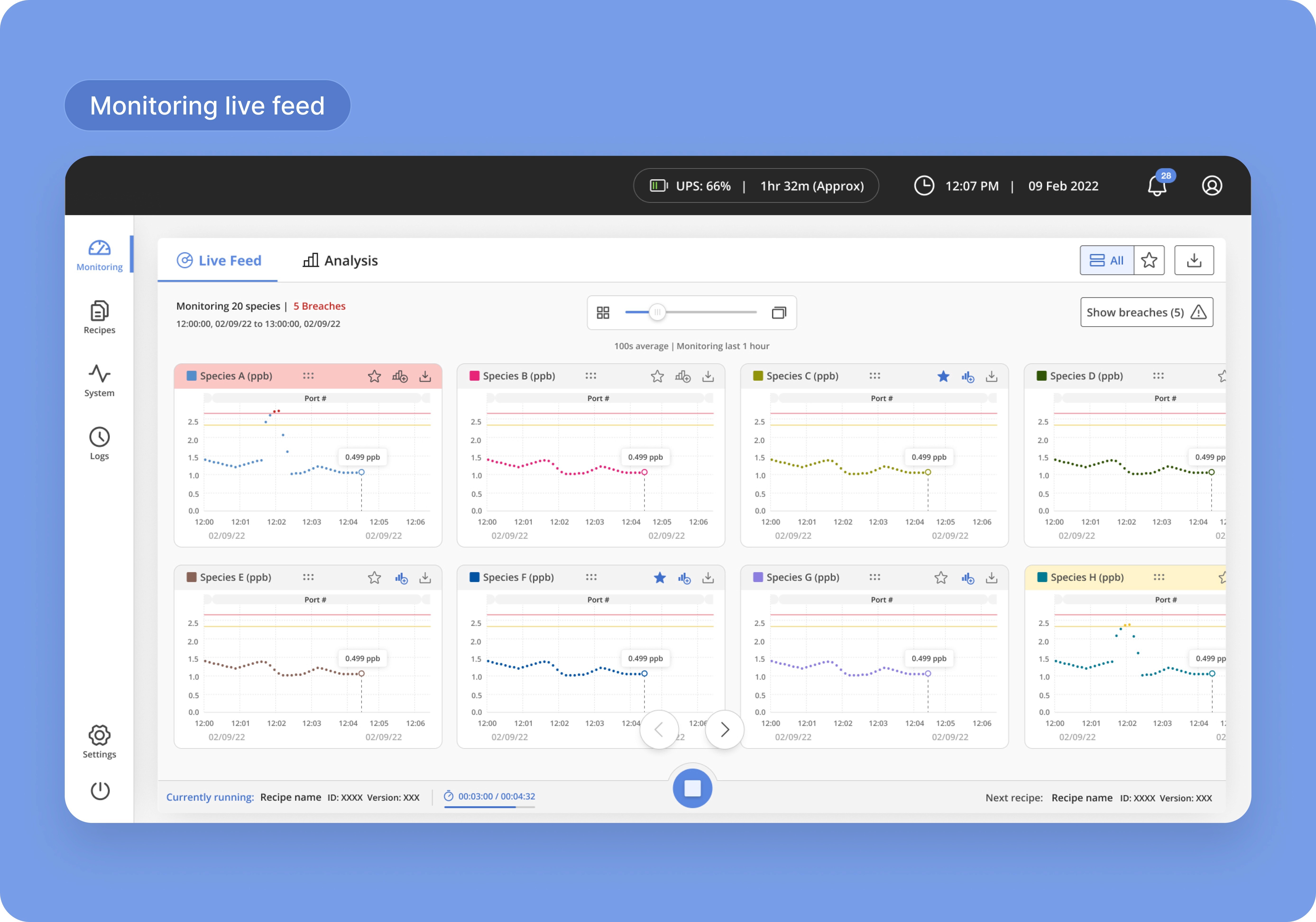 The dashboard facilitates real-time monitoring and analysis of various gases, issuing alerts for areas that need attention. It also empowers users to generate and share reports, along with the ability to continuously run new recipes for measuring gases in different ports.